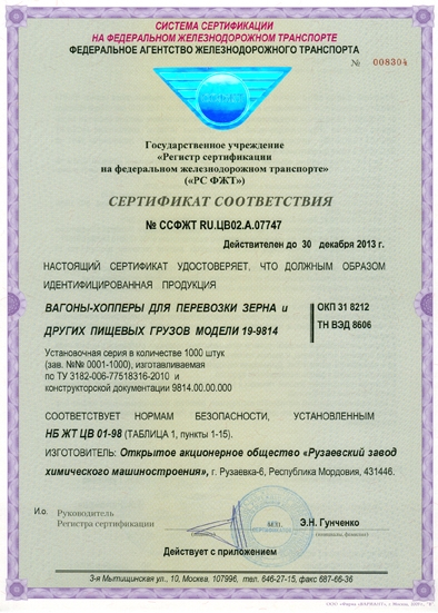 The hopper wagon 19-4109-01 is designed for transportation of grain and other similar food cargoes in bulk via the 1520 mm gauge main railway network, ensuring protection of the transported cargo from atmospheric effects.